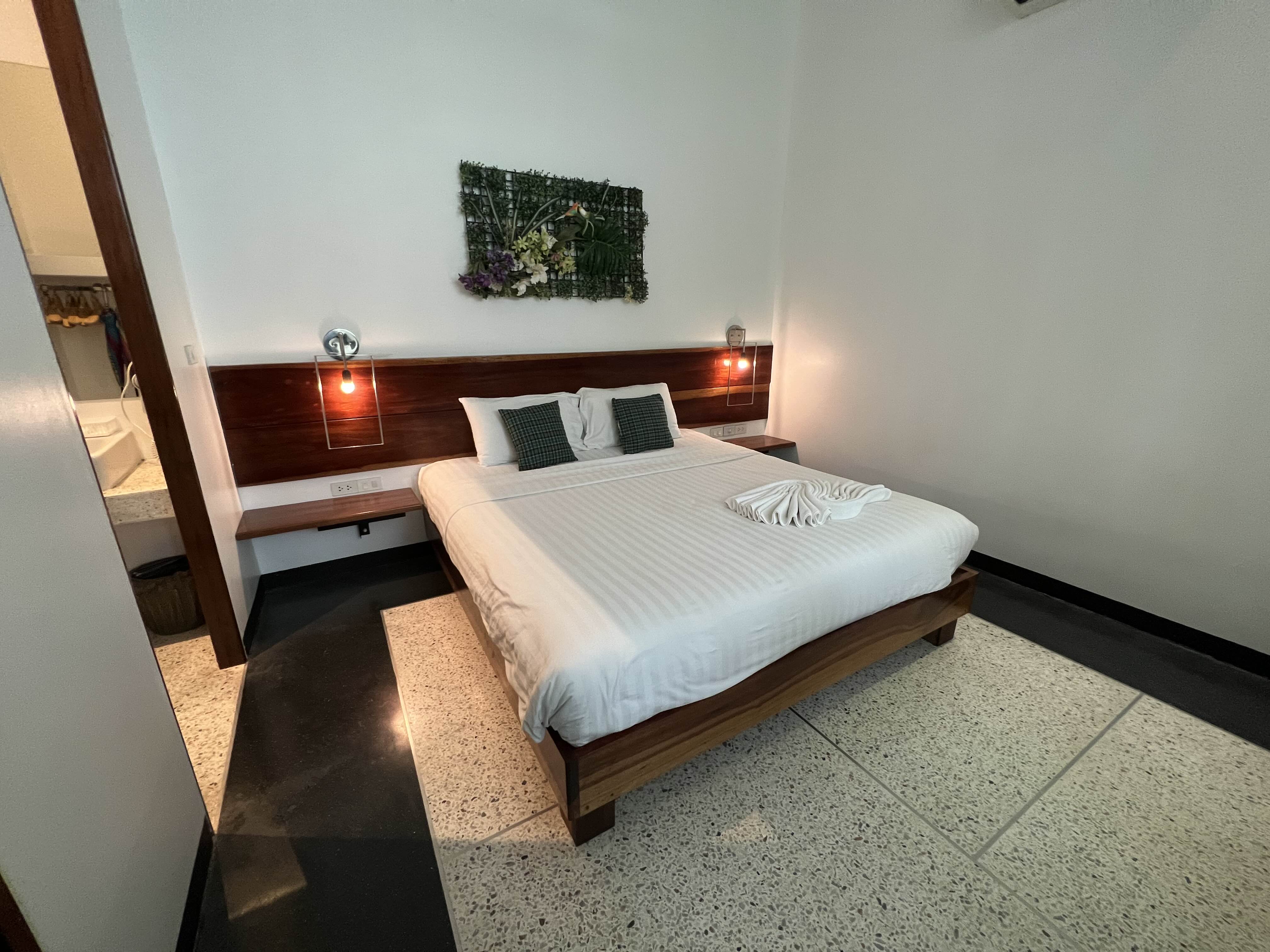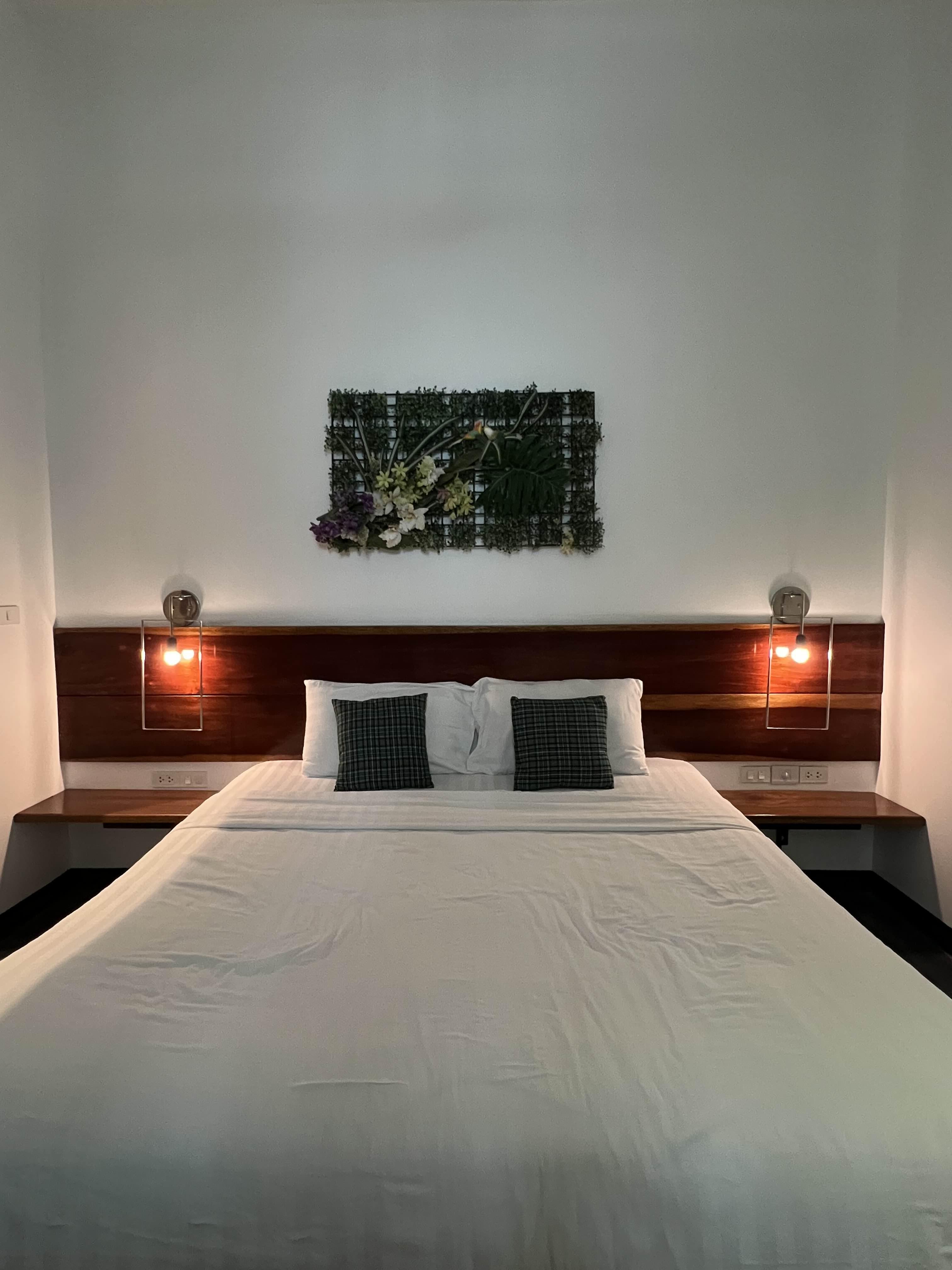 체크인 후 직원에게 방을 안내받았습니다. 저렴한 곳이지만 리조트 느낌이 물씬 납니다. 더블 베드가 있는 방을 예약했습니다. 나무와 풀 인테리어 그리고 조명 때문에 분위기가 너무 좋았습니다.