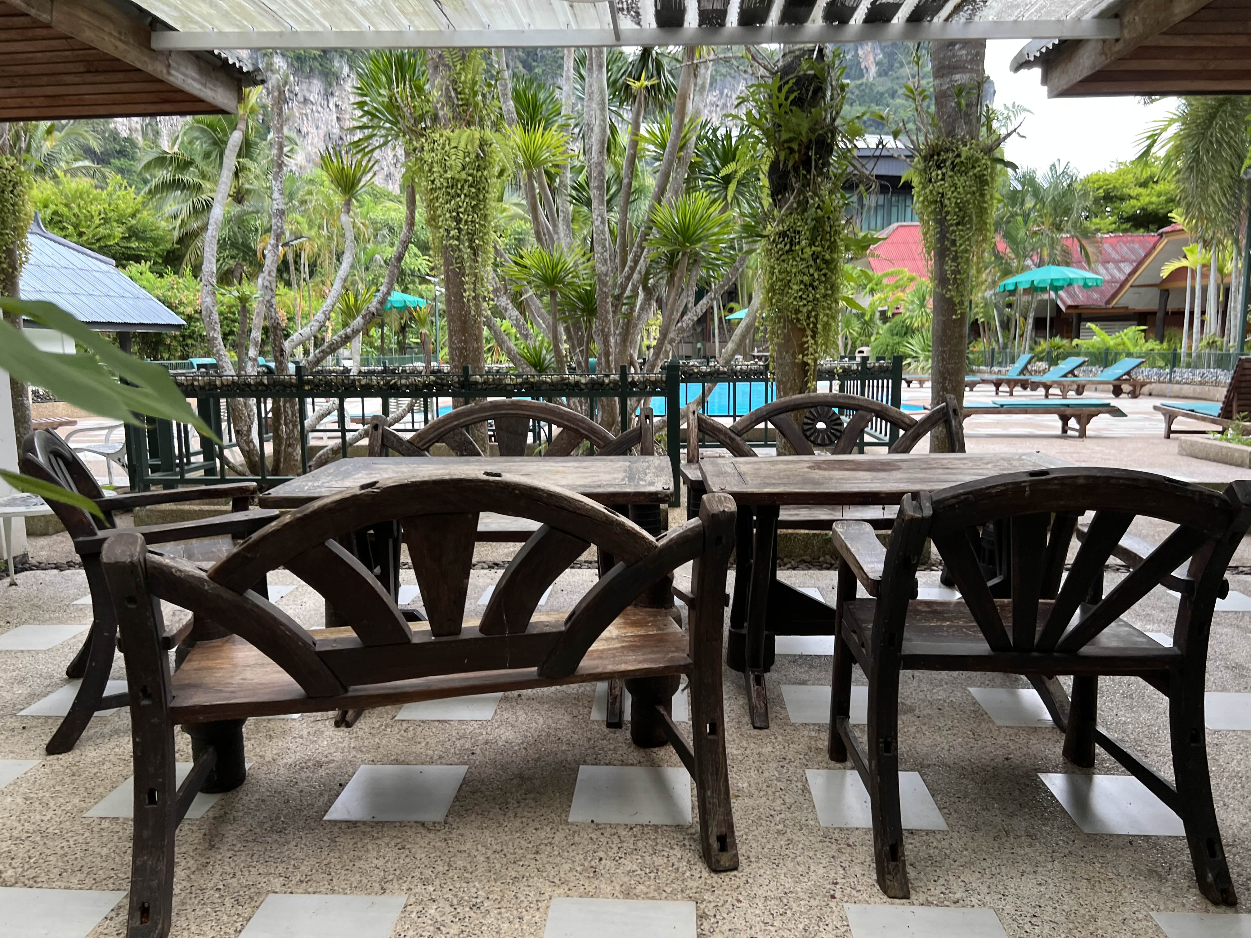 그리고 문을 열고 나가면 테이블과 의자가있습니다. 여기서 식사를하거나 커피한잔하기 참 좋더라고요. 그리고 나무의자라 수영을 마치고 쉬기도 좋더라고요. 하지만 모기가 많기때문에 모기 기피제는 필수 입니다. 태국 모기기피제를 사용하세요.