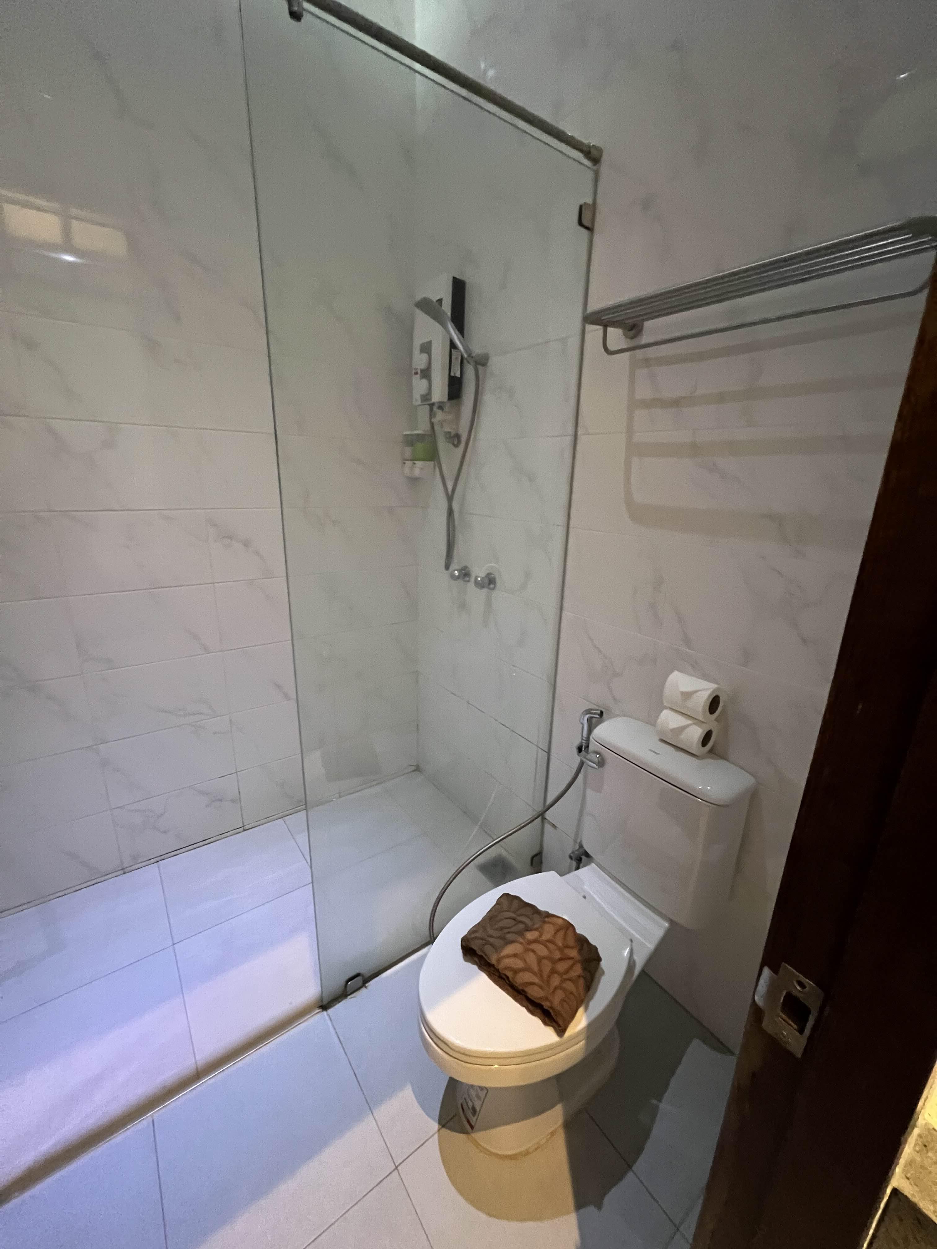 그리고 화장실입니다. 깔끔하죠 청소도 깔끔하게 되어있고 휴지도 넉넉하게 주네요. 침대 위에는 샤워타올이 2개가 올라가져있습니다.