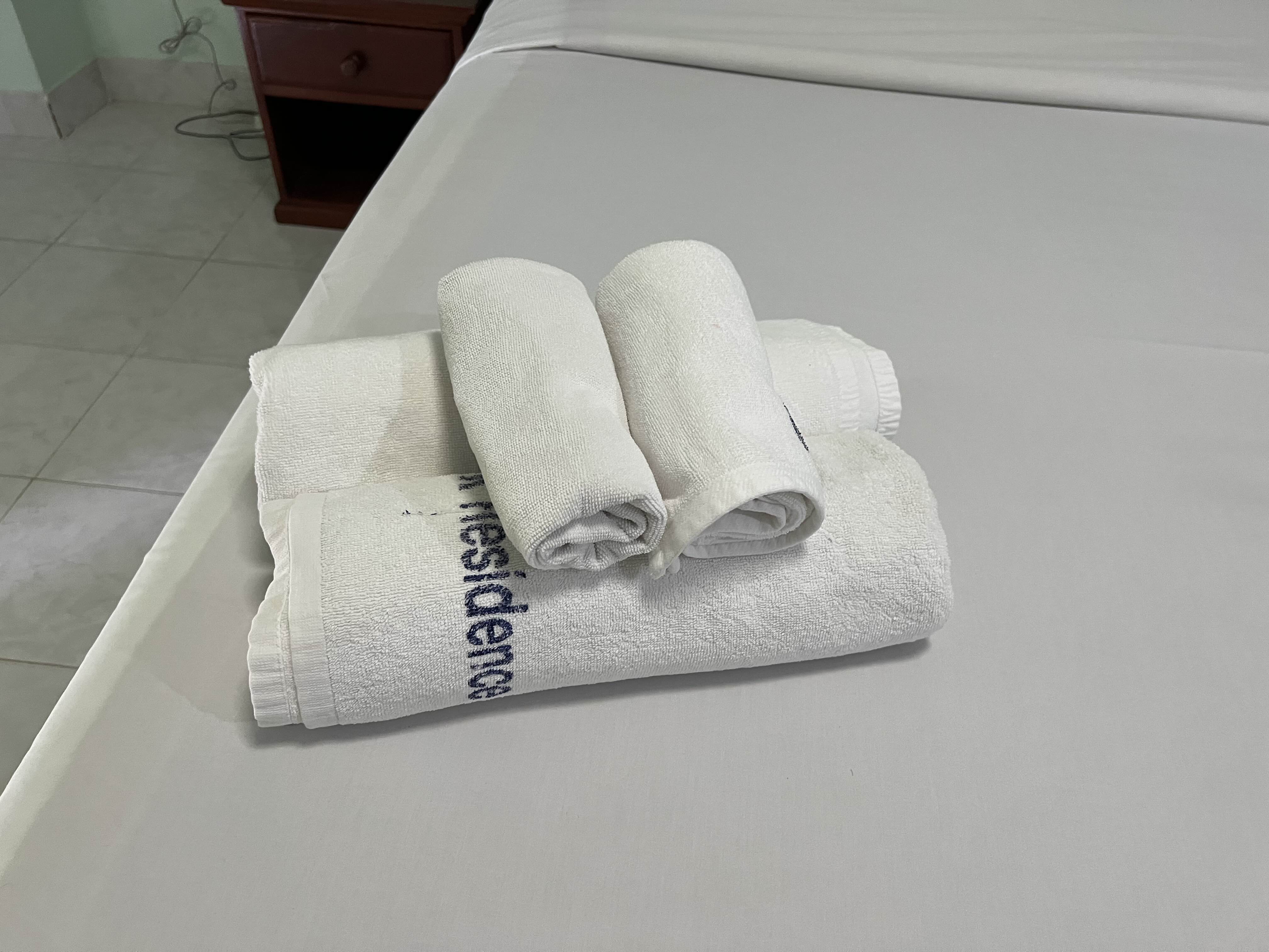 방안에는 더블 베드가 있고 수건도 큰수건, 작은수건 2개씩 제공됩니다. 침구류는 깔끔한 편이였습니다.